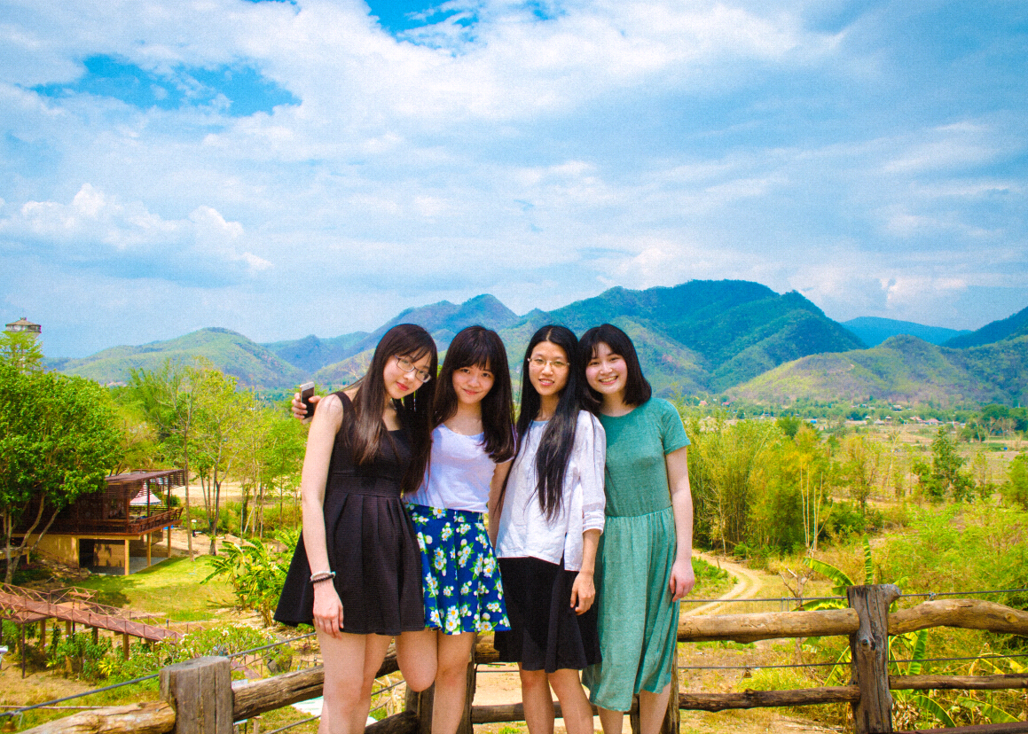 大二大四背包客毕业旅行,摄于泰国派县大树秋千旁。右起依次为陶如意、朱晗宇、罗昊、陈詠欣