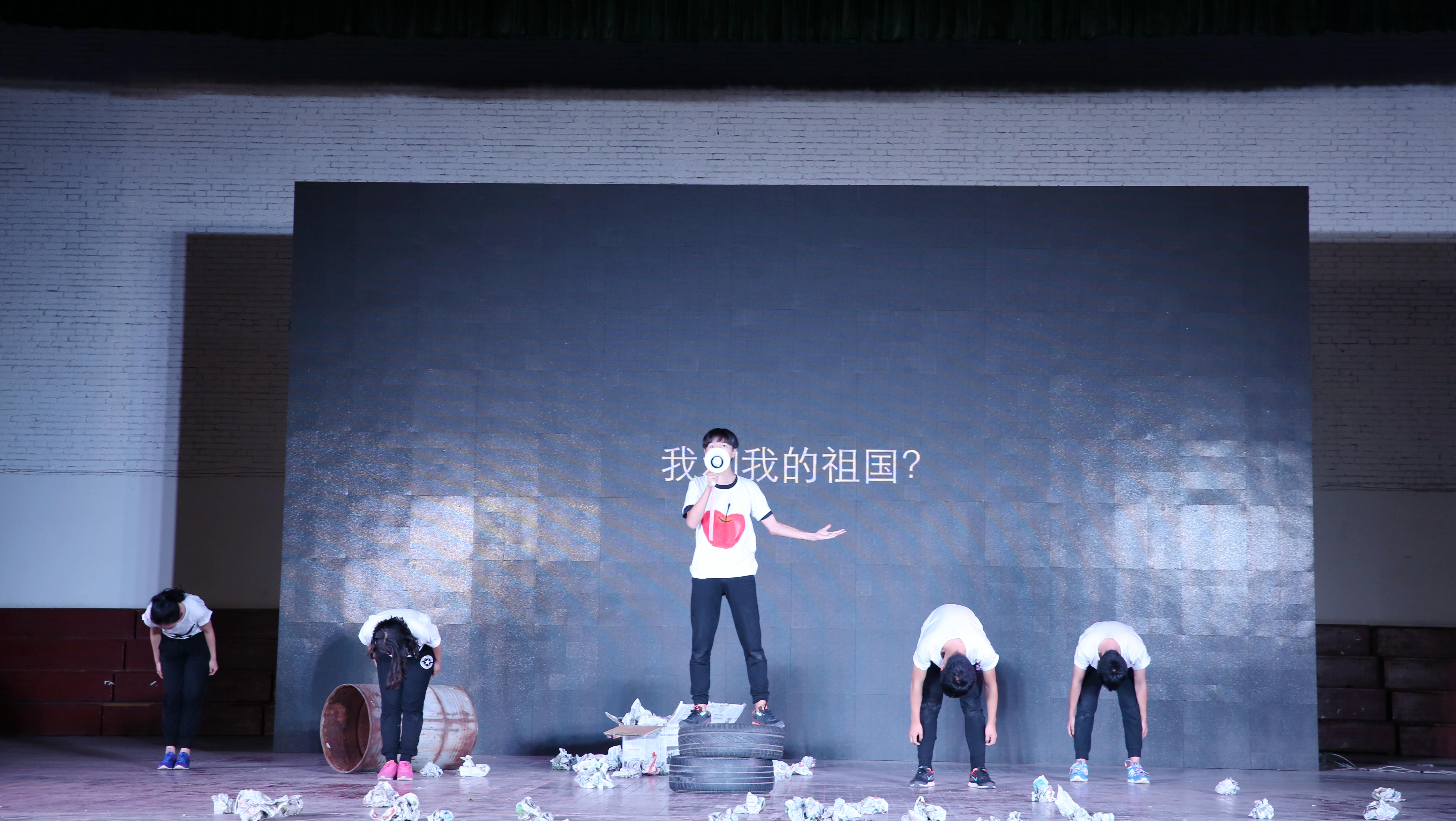 情景剧作品《干出一片新天地》仍旧延续了先锋剧的形式,表演人数少,道具极其简单,用演员自身极具表现力的夸张演绎直击现实背景下年轻人的困惑、选择和坚守。京剧元素的巧妙穿插,震撼的原创音乐,以及用“小苹果”的隐喻紧凑地串联起“爱”“讲故事”“为什么”的情节。富有新意的回归爱的主题,作为90后的我们,要能够“放下怨念,不再抱怨,扛起责任,奋勇拼搏”,因为我们终究成为中国的主人。整部剧着眼于现实,流露出主创人员理性独特的思考,营造出了震撼人心的力量。