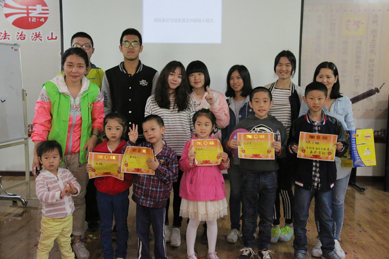 在最终决赛,三为晋级小朋友为争夺“最终大奖”,努力回忆着今天学到的知识。沙龙活动结束,青年志愿者们为表现优秀的小朋友们颁发奖状和奖品,同时青年志愿者与孩子们欢乐合影。