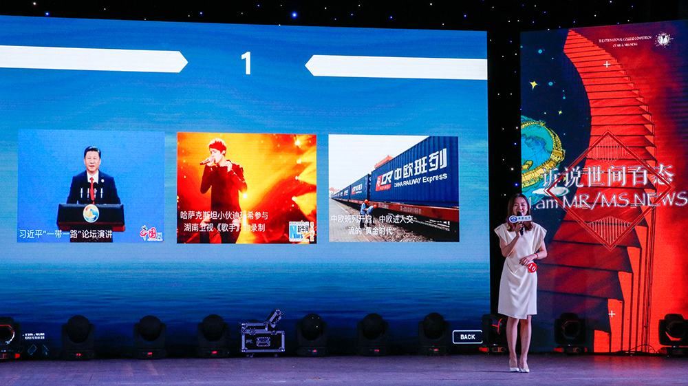 作为新闻先生新闻小姐大赛的传统环节,“新闻联联看”要求选手在一分钟内对间隔弹出的3幅新闻图片进行阐述,并有条理地串联成完整的新闻播报。从“美国在韩国部署萨德系统”、“马克龙当选法国新一任总统”到“中国职工在马里兰大学毕业典礼的演讲引发热议”,再到“共享单车”、“朗读亭”、“斗鱼直播”,涵盖多个领域的新闻热点不仅要求选手们拥有宽广的新闻积累和视野范围,也考验着他们的临场素质和语言组织能力。来自tyc33455cc太阳集团的丁雨萌从中国外交的主题入手,巧妙地串联起“习近平一带一路论坛演讲”、“哈萨克斯坦小伙迪玛希参与湖南卫视《我是歌手》录制”、“中欧进入交往的‘黄金时代’”三个新闻,鲜明的观点、严谨的逻辑让评委老师们眼前一亮。