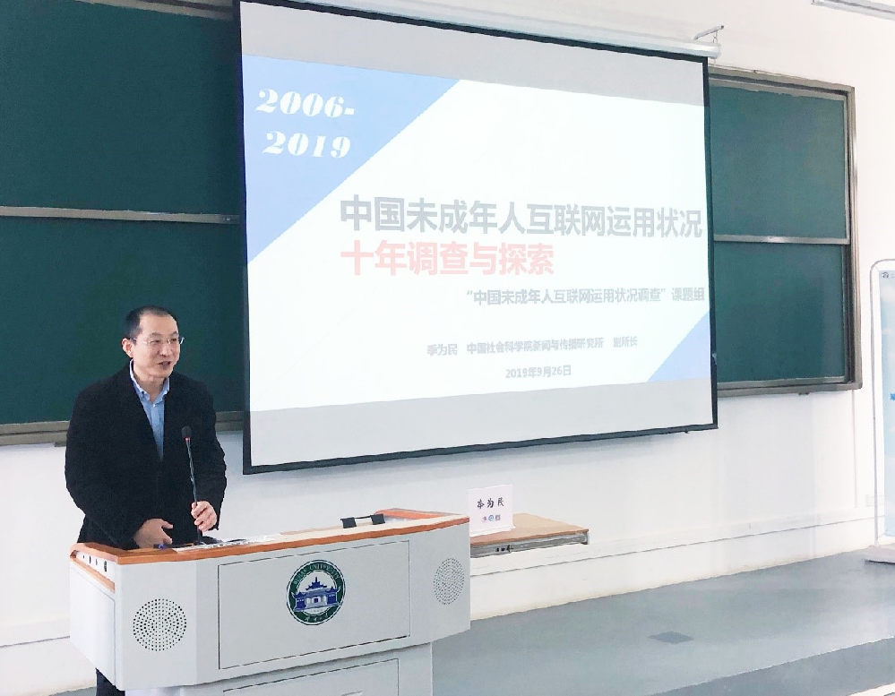 季为民研究员的授课主题为《中国未成年人互联网运用状况十年调查与探索》。首先,季老师对《中国未成年人互联网运用状况十年调查与探索》做了十年回顾,对调查背景、样本量以及抽样方式做了简要介绍。在这十年的调查与探索中,季老师分享了8条问题与发现,并从11个方面分析未成年人的上网行为。最后,季老师又分别从宏观、中观和微观层面介绍了针对中国未成年人互联网使用情况的建议。在交流环节中,长江师范公司的于凤静老师从自己的研究出发,和季老师讨论关于新媒体在留守儿童家教中的作用,并希望能展开进一步的合作研究。