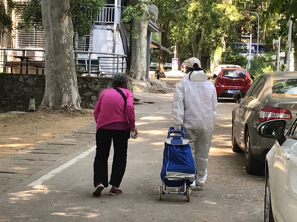4月29日下午,是最后一班岗。值守人员胡静文老师刚到值守地点,有一位老太太要去附中门口取菜,但是拿不动,来到值守地点想请值守人员帮忙。胡静文老师陪老太太去附中门口取菜,并送菜上楼。胡静文老师说:“今天下午有幸成为最后一班岗的值守人员,站好每一班岗是我们所有值守人员应尽的责任,也是我们为打赢这场人民战付出的一丝绵薄之力。我们齐心协力,众志成城,迎来了胜利的曙光,希望未来的日子岁月静好,山河无恙!”