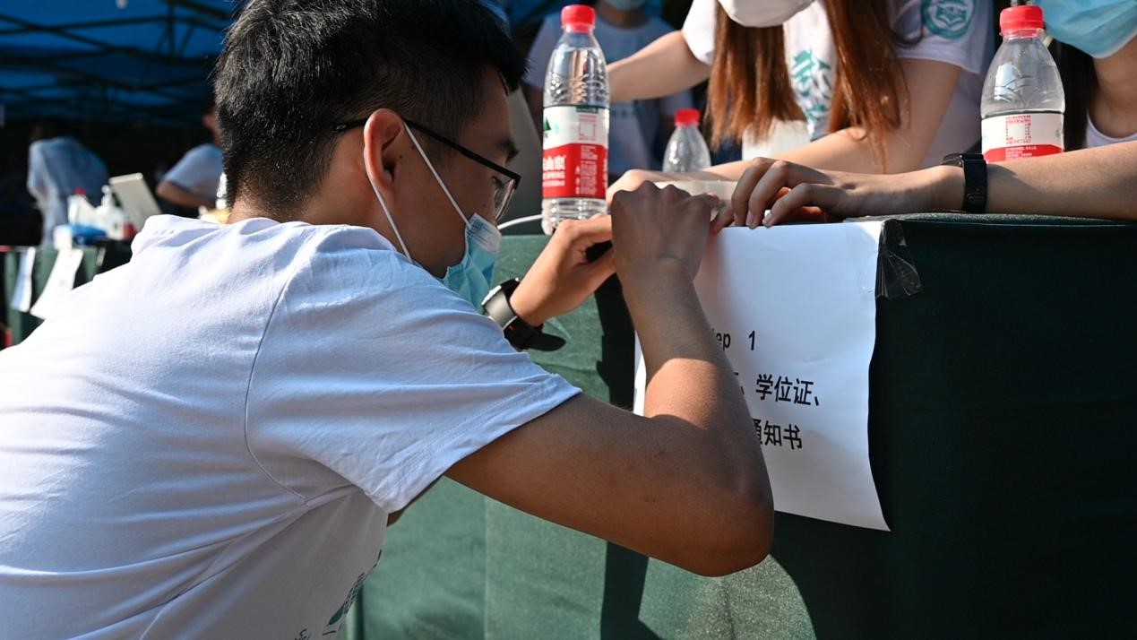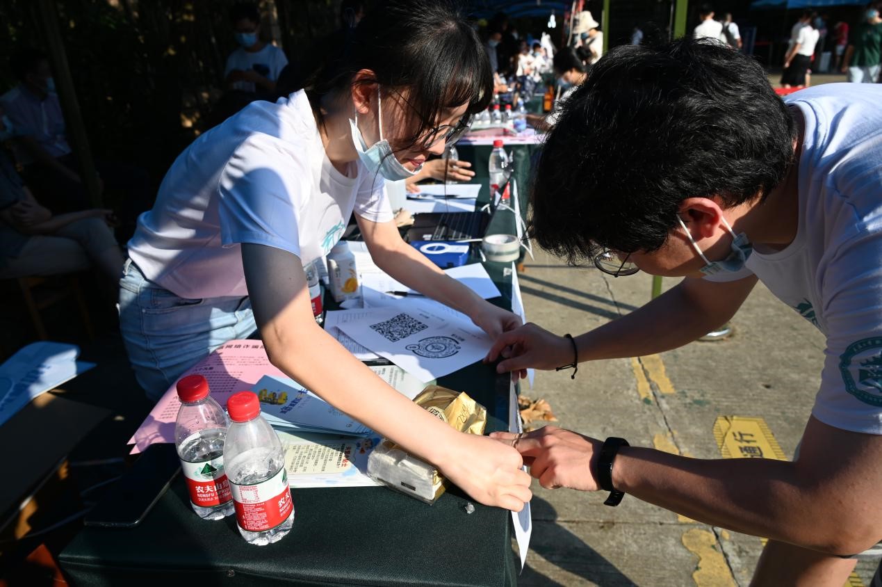 经过紧张有序的现场布置,8点迎新工作正式开始。查验双证、注册、签到、发放校园卡和装有防疫用品、新生手册等物品的新生礼包,工作人员分工明确、各司其职,所有流程有条不紊地进行着。