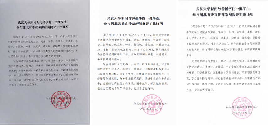 湖北省委宣传部为新闻阅评团队开具的工作证明