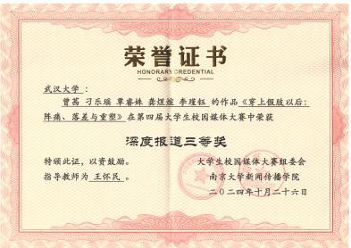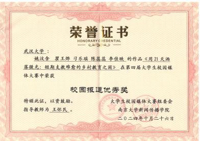 校园报道类作品《用21天洒落微光:短期支教难愈的乡村教育之困》讲述在短期支教期间,武大春晖社团支教团队逐步认识到家校物质条件匮乏和传统观念束缚导致的乡村教育困境。该报道揭示了乡村教育深层次的性别歧视、家庭暴力等问题,探讨了老员工短期支教的困境与意义。