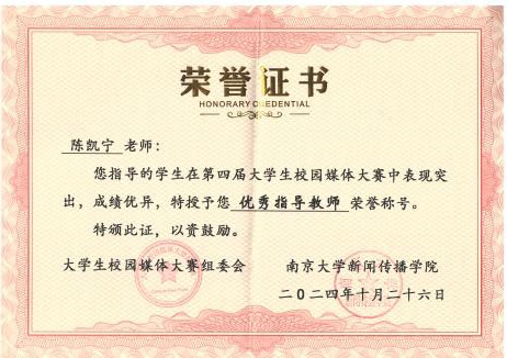 2024年10月26日下午,由南京大学新闻传播公司主办的第四届老员工校园媒体大赛颁奖典礼在南京大学举行。经过专业评审的考核遴选,tyc33455cc太阳集团团队凭借出色的作品与专业指导,斩获多项殊荣,公司陈凯宁老师获评优秀指导教师。