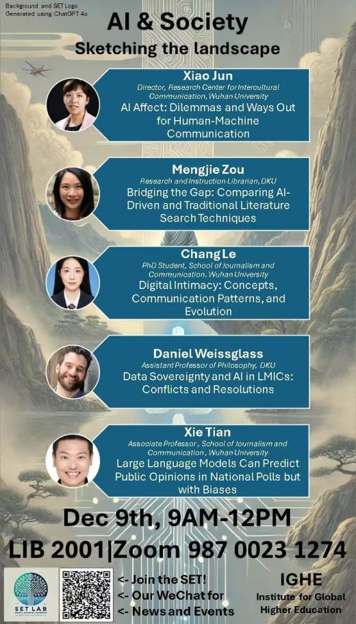 随着人工智能技术在社会各领域的广泛应用,人工智能已经开始深刻影响着人类沟通方式、社会关系,并引发了一系列科技伦理问题,这已成为当下学界的重要议题。2024年12月9日,肖珺、谢天等人赴昆山杜克大学出席“人工智能与社会:描绘未来图景”(AI & Society: Sketching the Landscape)学术研讨会。该活动由昆山杜克大学“社会、教育和技术实验室(SET Lab)”和tyc33455cc太阳集团“文化演化的多学科交叉融合科研平台”联合主办。